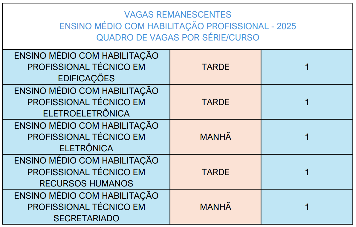 No dia 05 de maio, será divulgado o quadro de vagas por turma, informando a disponibilidade de cada curso e turno. Os candidatos farão uma prova objetiva única no dia 14 de maio, das 14h30 às 17h30, com permanência mínima de 1 hora. O resultado final será publicado em 19 de maio, e as matrículas acontecerão em duas convocações: a primeira nos dias 19 e 20 de maio, e a segunda no dia 21 de maio, nos mesmos horários das inscrições.